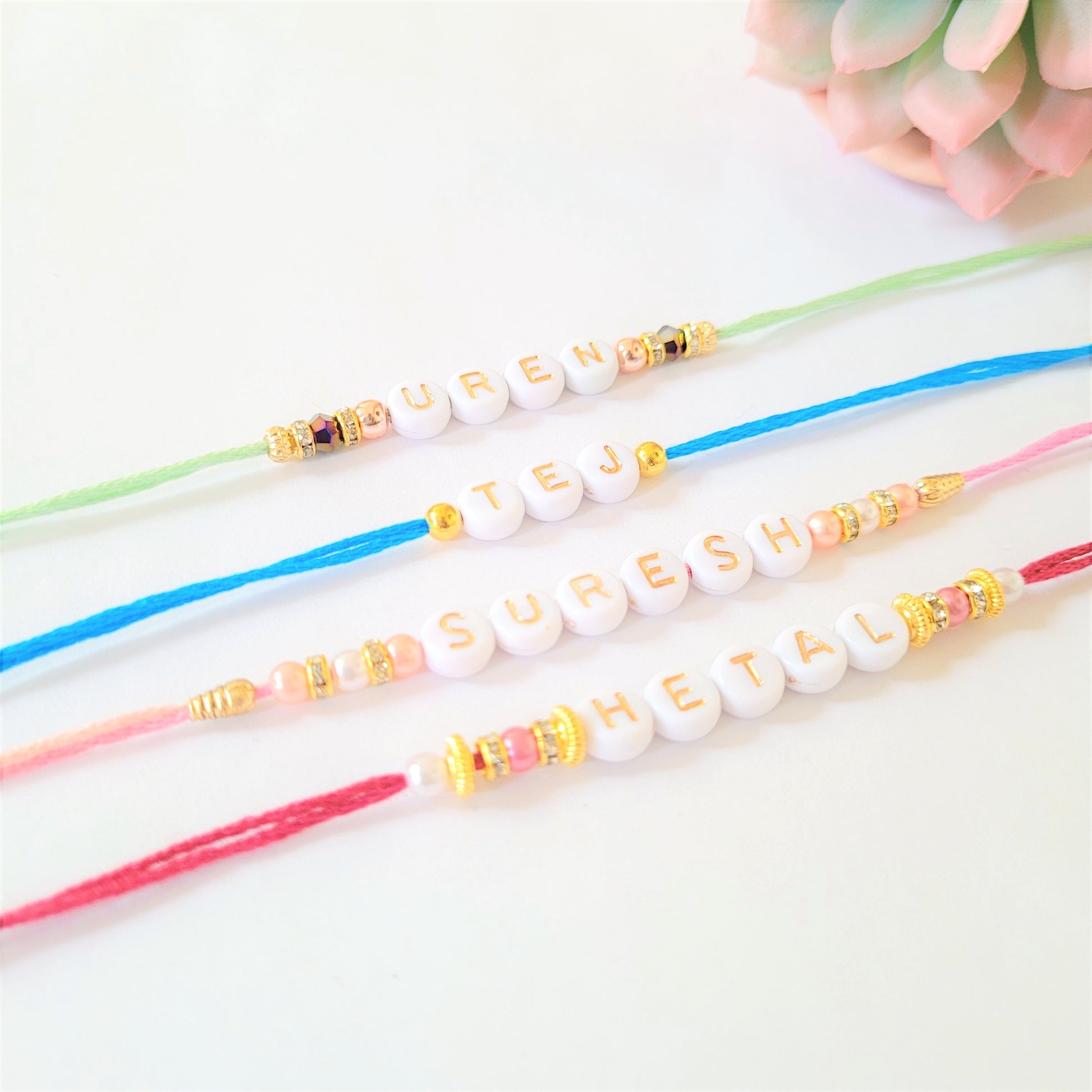 Personalised Rakhi/Rakhri, Raksha Bandhan, Gold and White Letter Beads